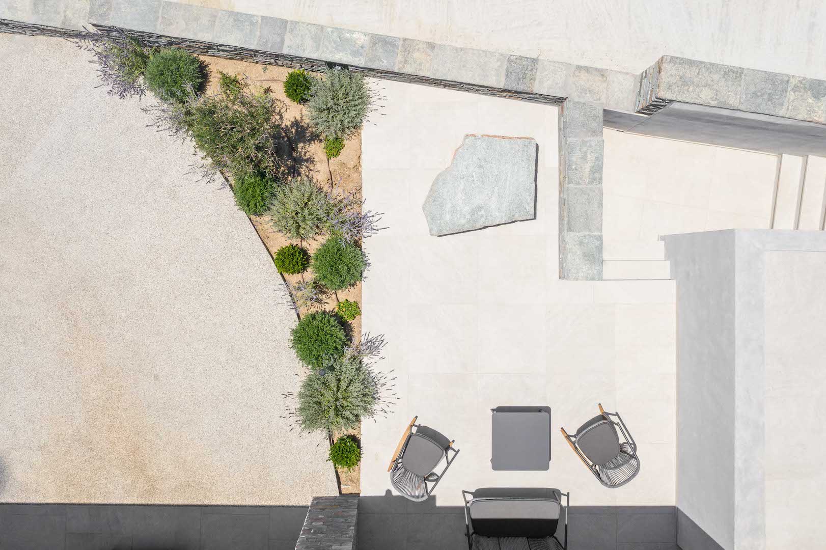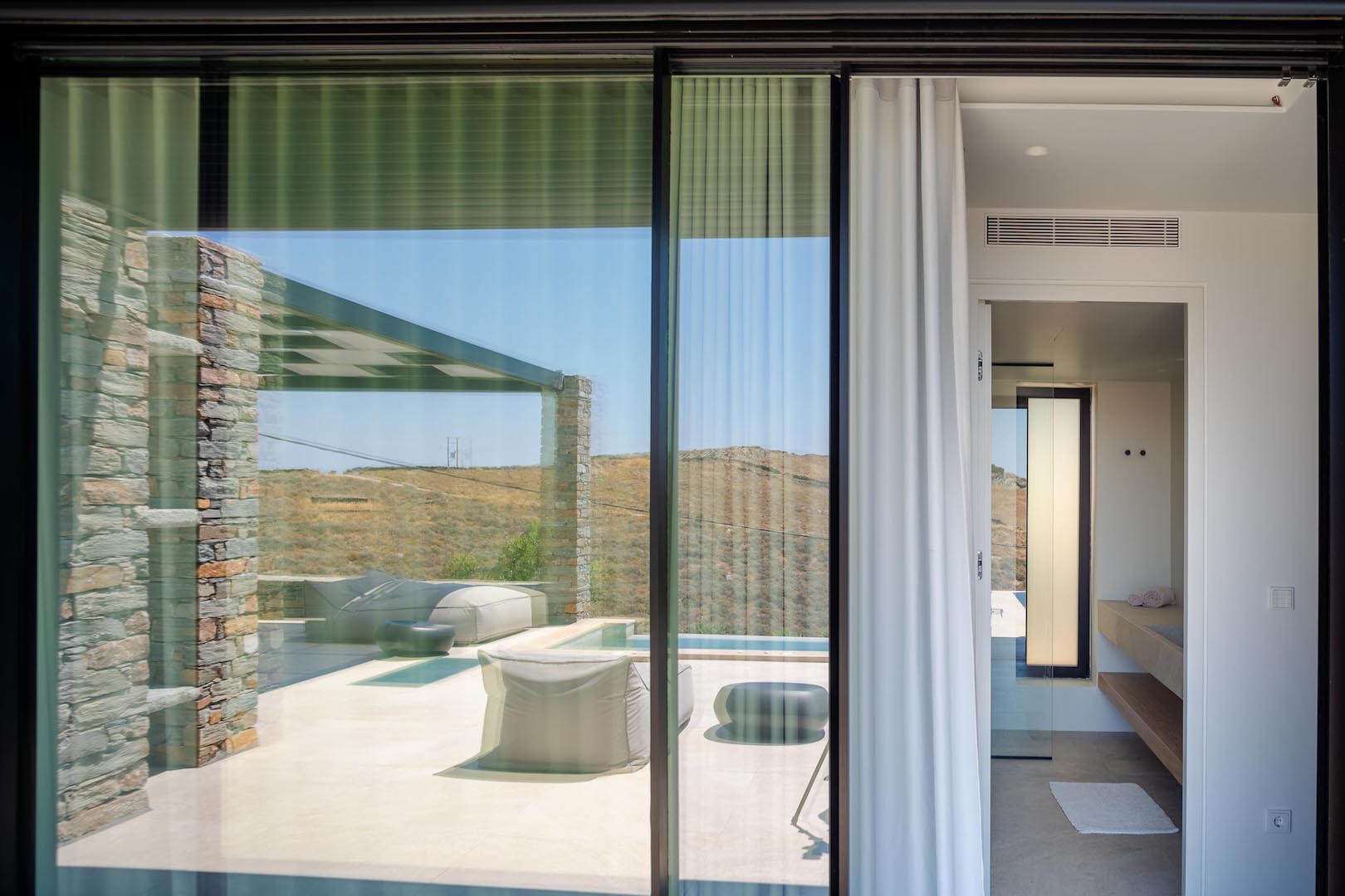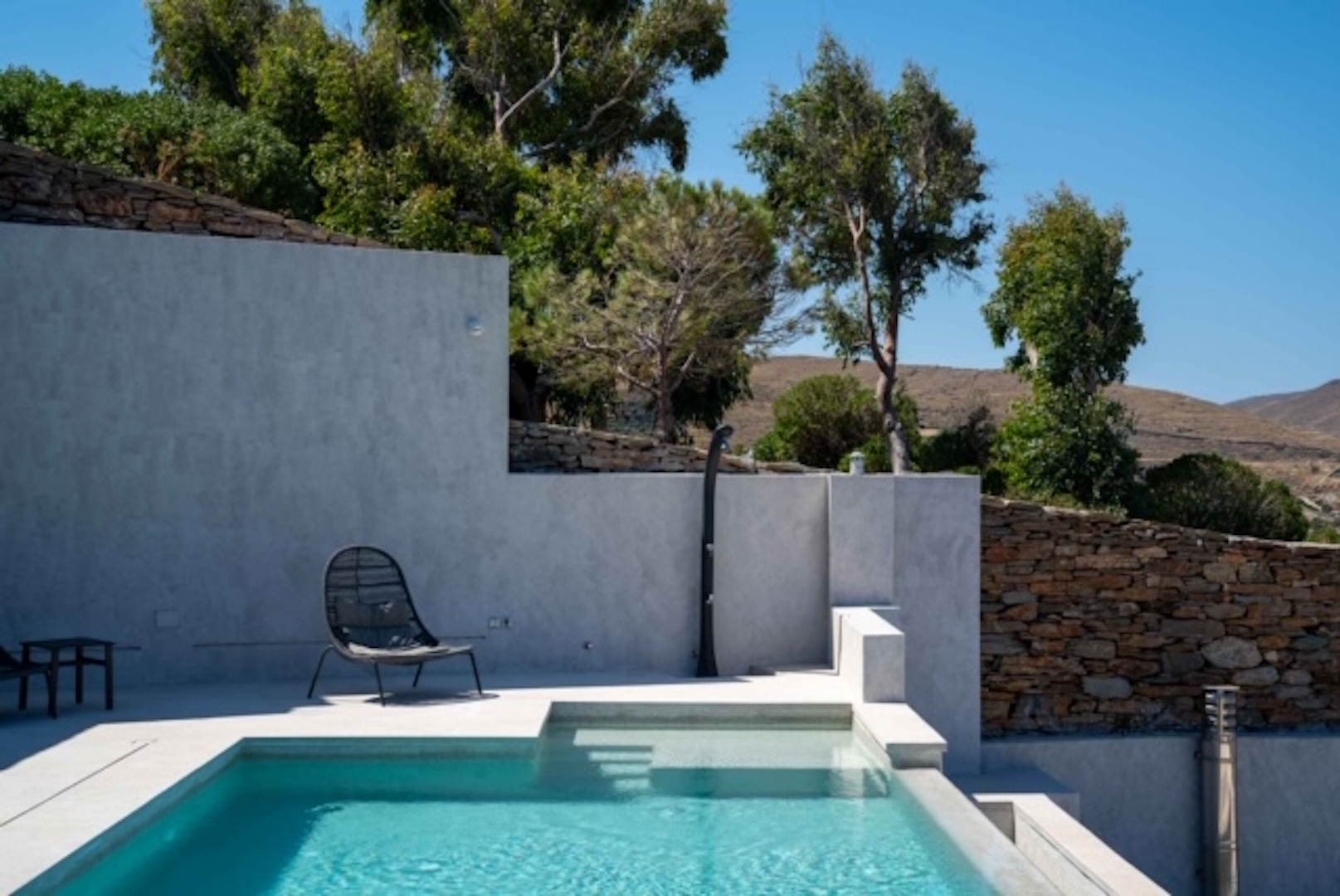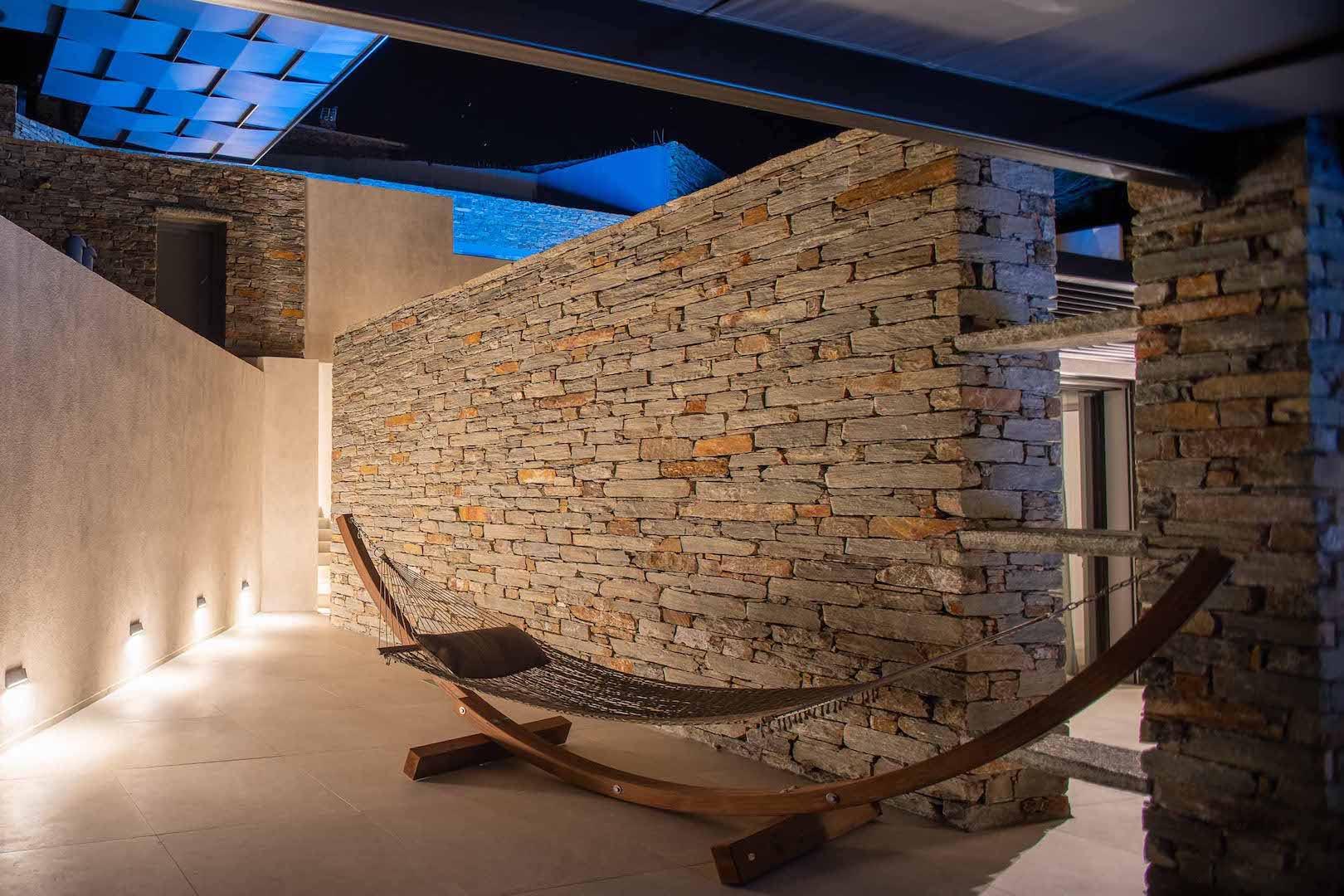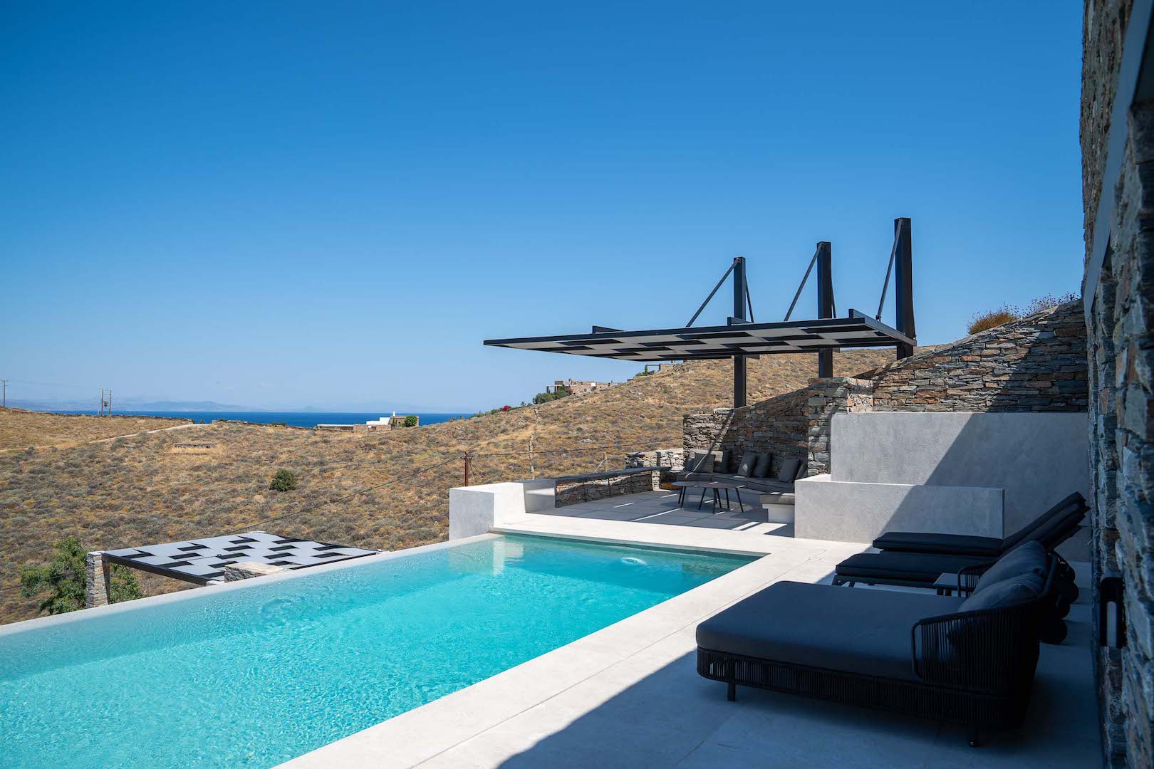 Its architectural design is fully blended with the area’s landscape: both outdoors and indoors, the local stone dominates its decor and in combination with wooden floors and furniture, it adds a tone of warmth and luxury to the space. The villa is equipped with carefully hand-picked furniture and decoration items, offers all modern comforts while the wide windows and doors allow the unlimited view of the calm bay to intrude inside all the areas, creating a unique atmosphere. At the same time, the villa offers multiple spacious verandas/ outdoor areas and modern bathrooms.