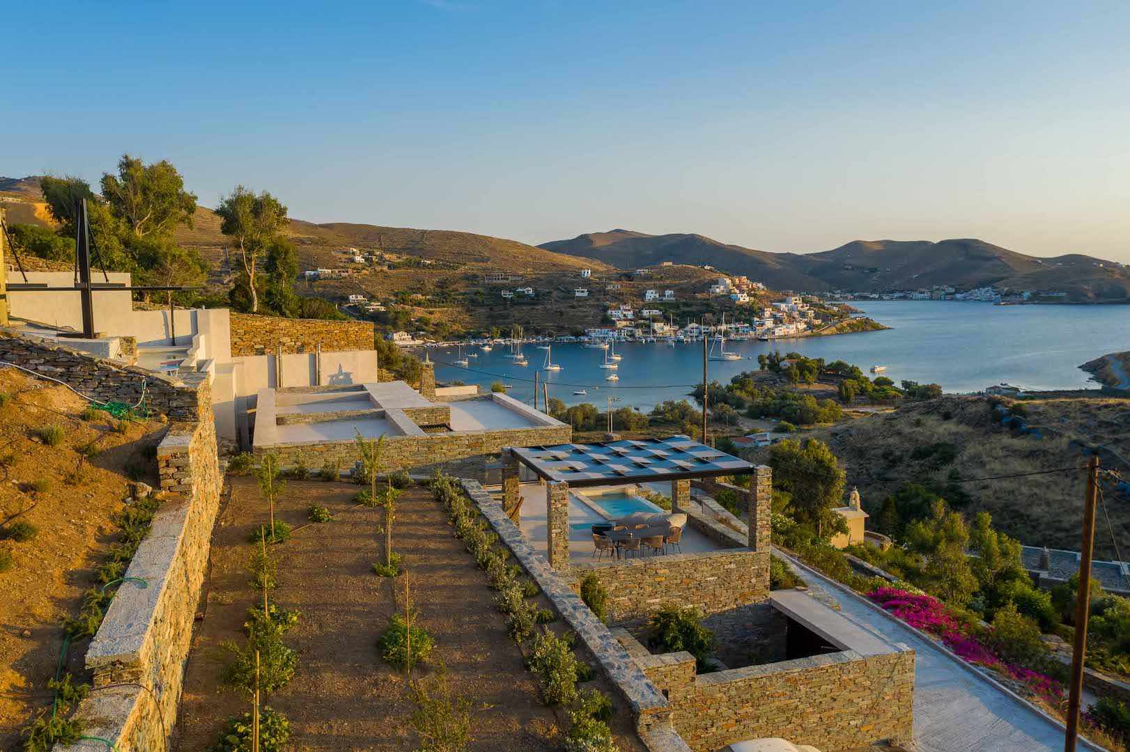 This stylish brand new villa perfectly hosts a big family or large group of friends in seven en-suite bedrooms. Making the most of its fabulous position, this property impresses with its magnificent indoor and outdoor areas, while its great location offers stunning sea and sunset views. The house is located in the cosmopolitan Vourkari bay of Kea, just 3 minutes drive from the port (Korissia) and 10 minutes drive from the picturesque Ioulida, the capital of the island.